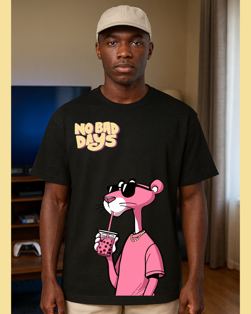 تيشيرت أسود أنيق مطبوع عليه عبارة NO BAD DAYS مع شخصية البانثر الوردي الشهيرة